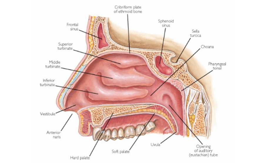 Le cavità paranasali (seni etmoidali, mascellari, frontali, sfenoidali) ricevono aria dal naso. Ogni alterazione disventilatoria porta nel tempo ad una sofferenza della loro mucosa di rivestimento ed alla insorgenza di sinusite. Quando la mucosa è degenerata per il lungo tempo di sofferenza aerea, le componenti cellulari cambiano, aumentano le cellule mucoidi e si ha la sinusite cronica.