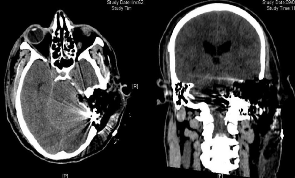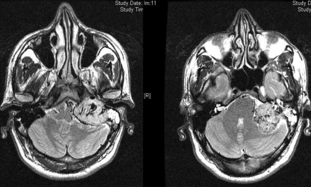 Nella RMN si vede nelle due metà a sinistra in corrispondenza dell’orecchio il nero corrispondente all’aria, mentre nelle due metà a destra si vede una neoformazione grigia irregolare che occupa tutto l’orecchio ed entra profondamente nel cervelletto (struttura triangolare inferiore). La lesione infiltrava la giugulare, la carotide e scendeva nel collo ad interessare i nervi glossofaringeo, vago, spinale, ipoglosso.
