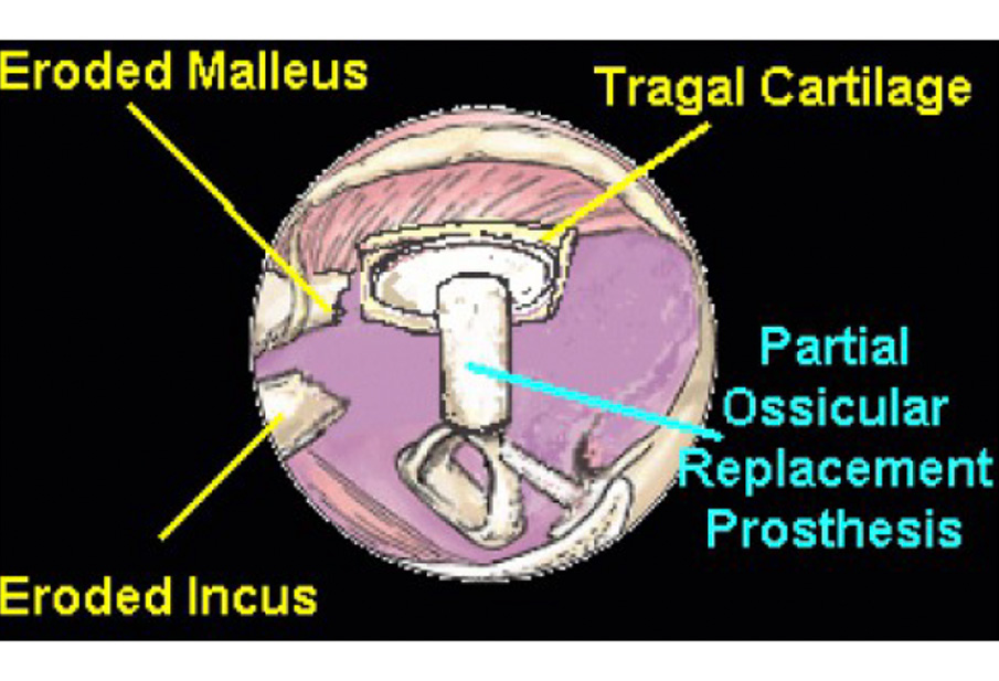 Erosione dell’incudine e del martello. Altra modalità di ricostruzione. In questo schema l’incudine (incus) ed il martello (malleus) sono erosi. Una protesi specifica per la parziale sostituzione degli ossicini (partial ossicular replacement prosyhesis) viene posizionata tra la staffa ed il timpano, con la sovrapposizione di cartilagine del trago (tragal cartilage).