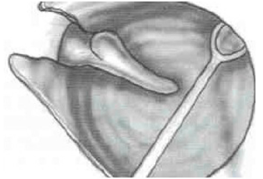 Erosione dell’incudine. In questo schema l’incudine è erosa (eroded incus). Una piccola parte di osso è stata rimodellata e posizionata tra la staffa (stapes) ed il martello (Malleus) per ripristinare la continuità ossiculare.