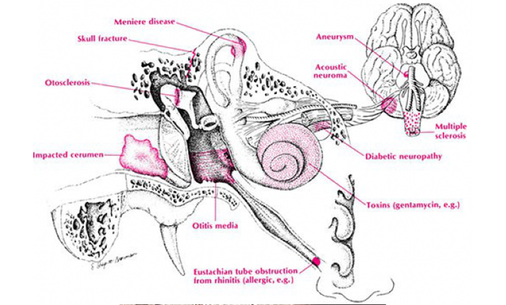 Alcune possibili cause di un abbassamento di udito (ipoacusia), oltre alla perforazione timpanica e all’otite cronica semplice e colesteatomatosa. Il cerume (la più banale), l’otosclerosi, l’otite media, l’ostruzione della tuba di Eustachio per patologie respiratorie, colpiscono l’orecchio esterno e medio e sono cause di Ipoacusia di trasmissione. Una frattura del cranio (skull fracture), la malattia di Meniere (Meniere Disease), l’intossicazione da farmaci (Gentamicina, Streptomicina, etc) colpiscono l’orecchio interno e sono causa di Ipoacusia neurosensoriale. La neuropatia diabetica, il neurinoma del nervo acustico colpiscono il nervo acustico e sono causa di ipoacusia neurosensoriale. La sclerosi multipla o un aneurisma di una arteria della base del cranio colpiscono il tronco encefalico e sono causa di ipoacusia neurosensoriale.